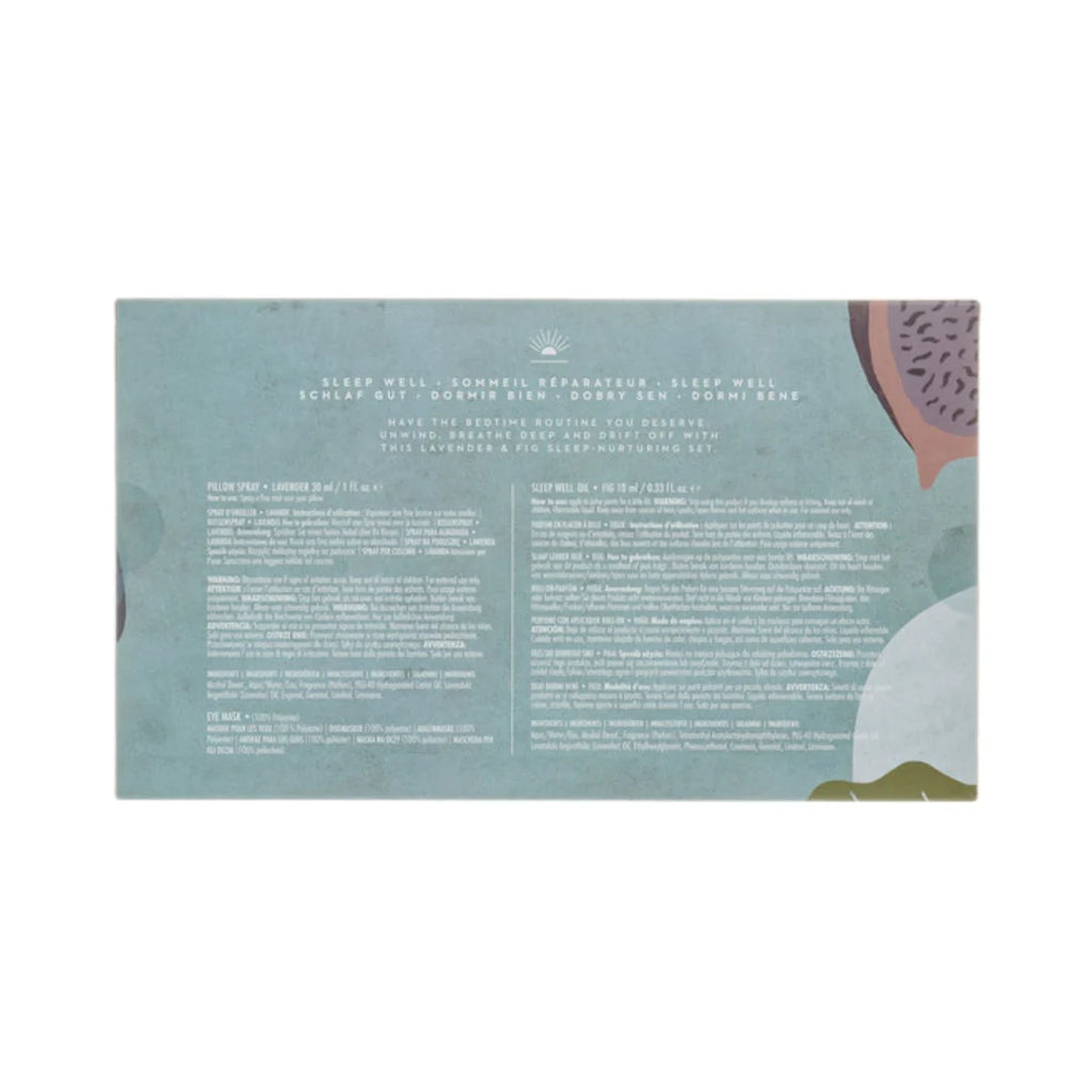- Contents: lavender & fig pillow spray, sleep-well oil roller, luxury eye mask.
