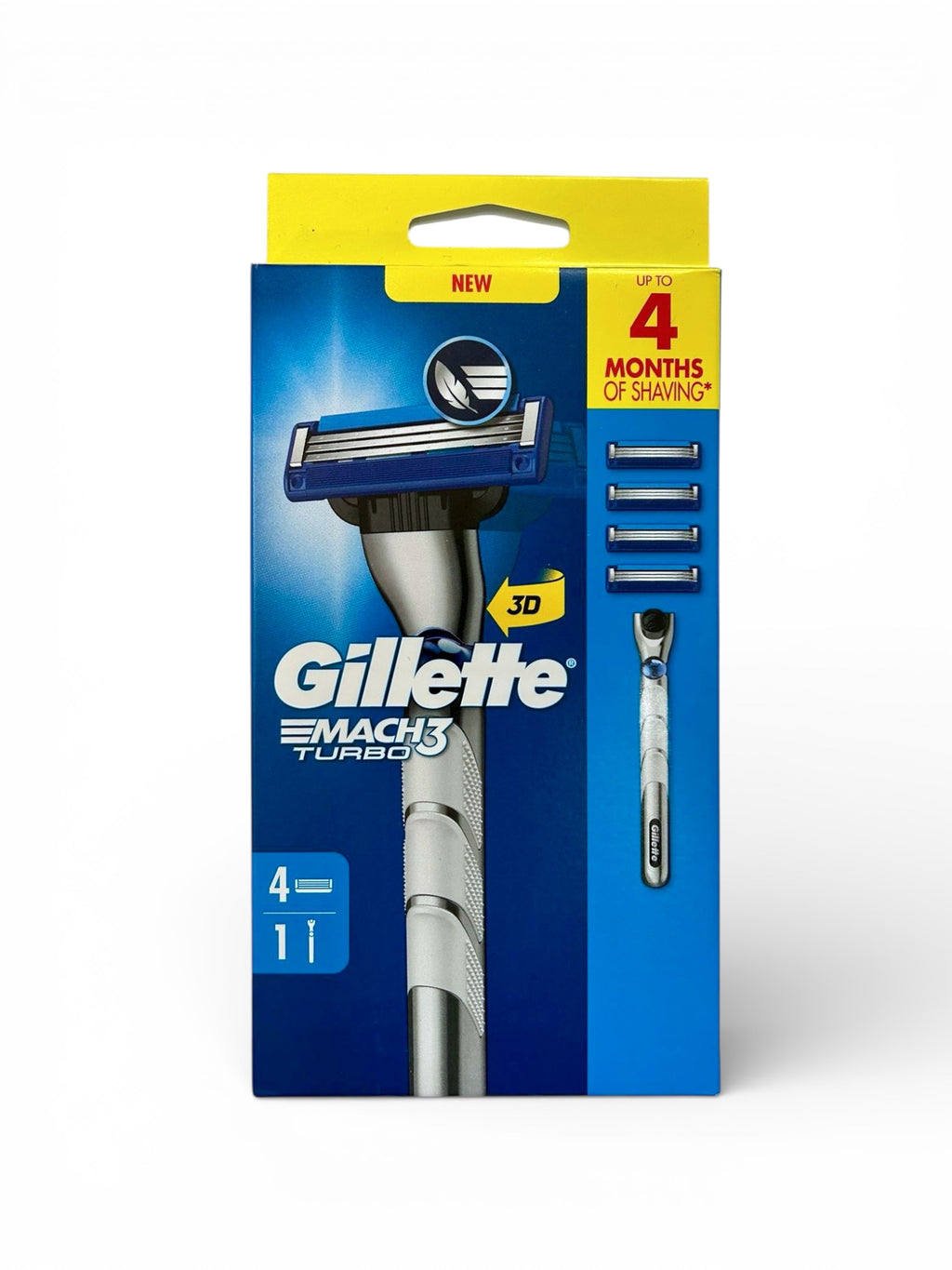 The Gillette Mach3 Turbo Razor is designed to deliver a smooth, comfortable shave with lasting performance. Featuring three precision blades, a gel comfort strip and skin guard fins, it helps the razor glide easily across the skin while reducing tugging and irritation. This set includes four blades, making it a practical choice for reliable everyday shaving.