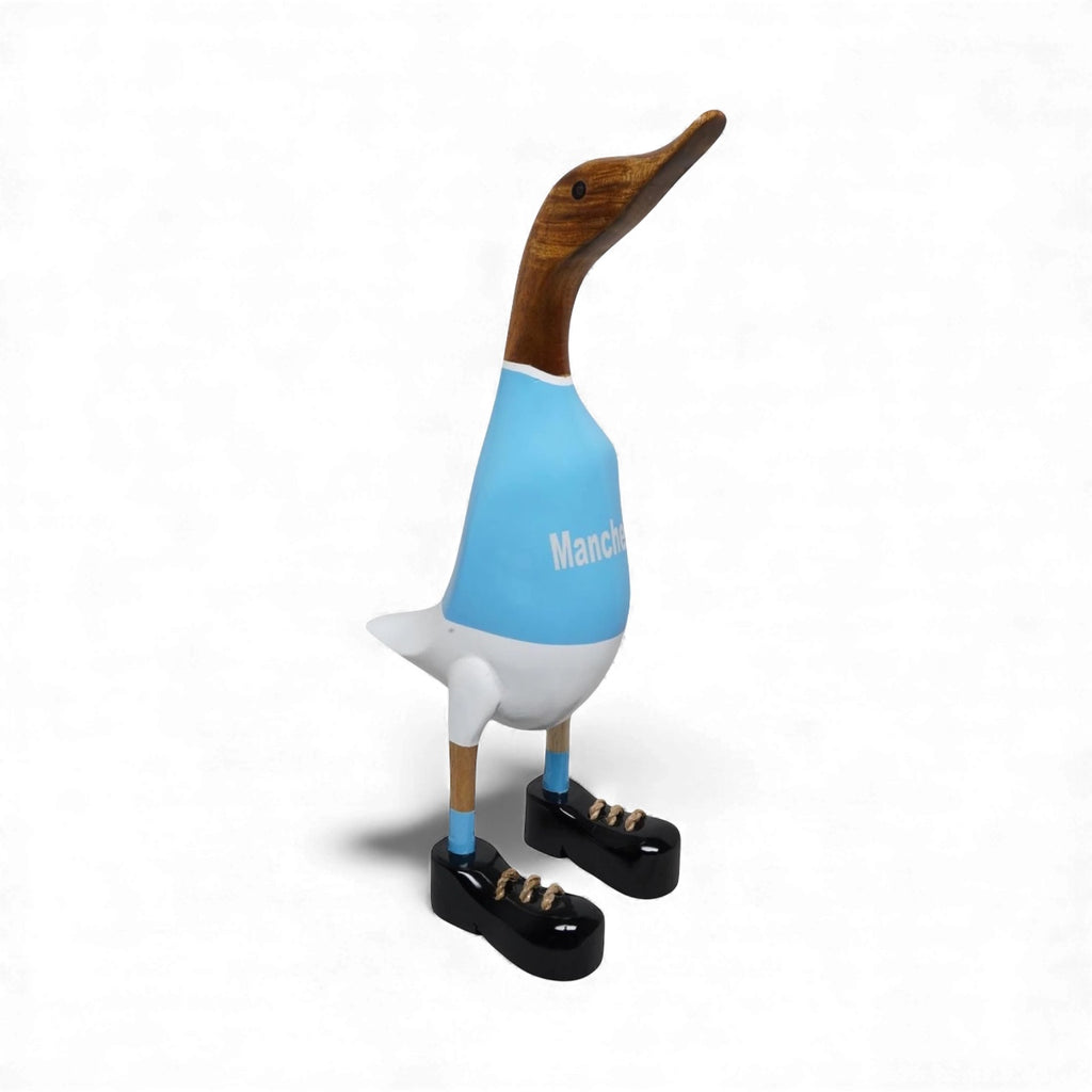 Show your colours with the Lucky Ducks Manchester Blue Supporter Duck. Each 35 cm County Quack is hand-carved from sustainable bamboo root and recycled plantation timber, finished in iconic blue and ready to perch on a shelf or hallway table. Designed in Ireland, it’s a standout gift for football fans and a fun talking point for the home.