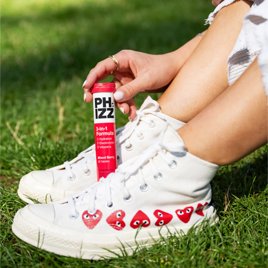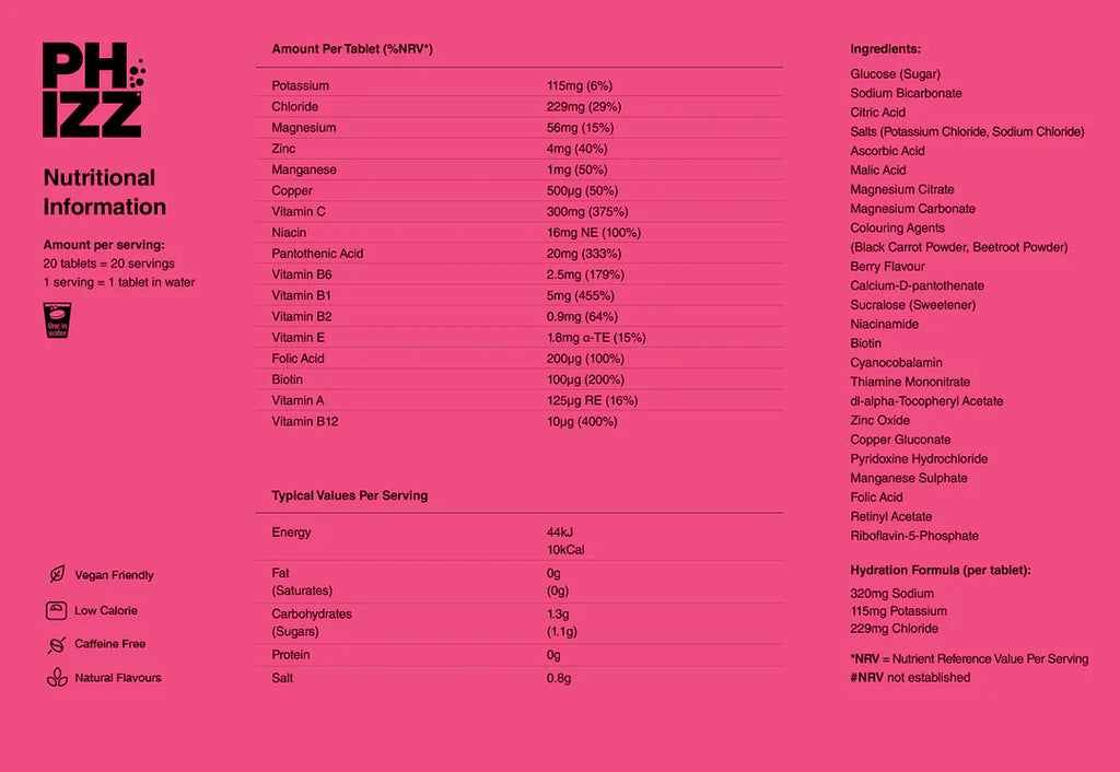 Stay on top of hydration with Phizz Mixed Berry 3-in-1 Hydration, Electrolytes & Vitamins (20 tablets). This hypotonic, effervescent formula supports fast hydration while delivering 18 essential vitamins and minerals for daily energy, immunity and performance.