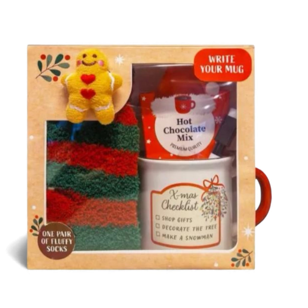 A cosy Christmas treat in a box: a festive mug, a write-on marker for a personal touch, and warm gingerbread socks for snug nights in. Easy to gift, easy to love — perfect for fireside cocoa and cheerful mornings.