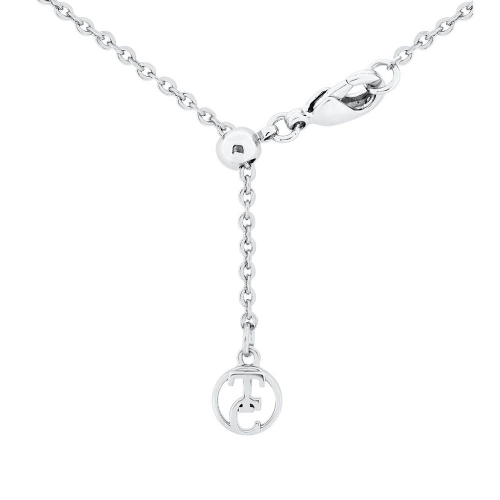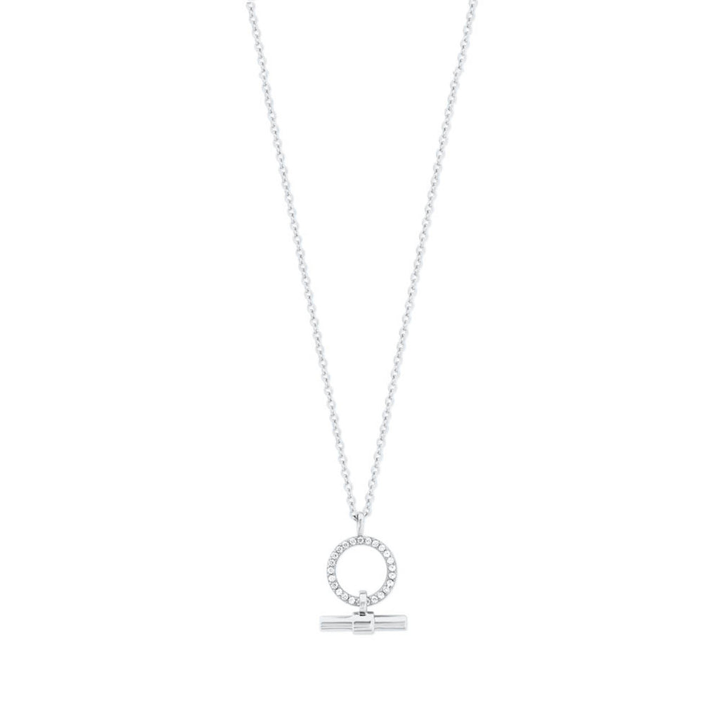 Silver-plated Tipperary Crystal necklace from the T-Bar Collection, featuring a crystal-embellished circle with a slim bar drop on an adjustable chain. A wearable everyday silver necklace that works on its own or layered, finished with an anti-tarnish coating and supplied in a Tipperary Crystal gift box — ideal gift for her, mum, nan.